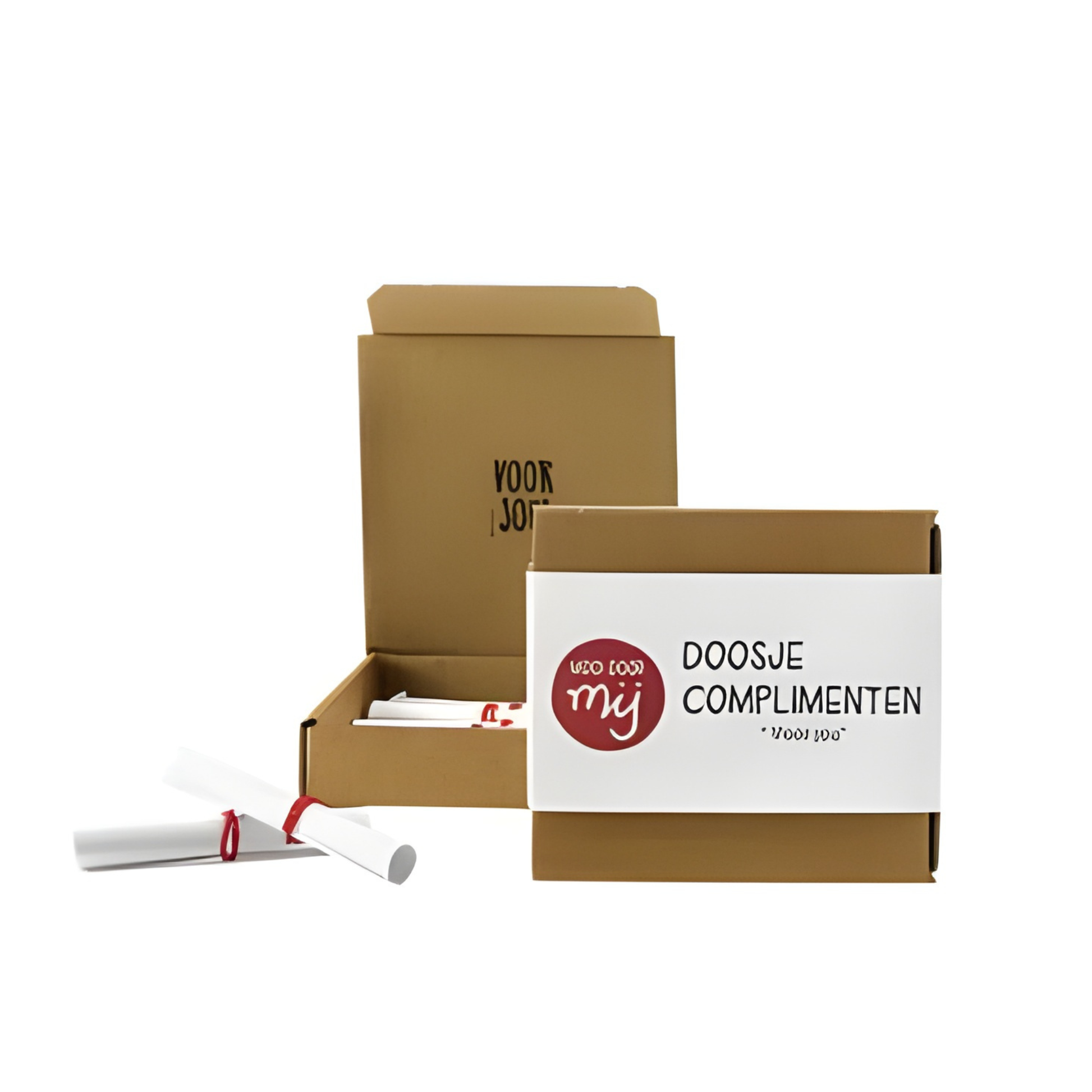 Geef een week lang elke dag een compliment met dit doosje met 7 fijne teksten als "Jij bent goud waard" of "Jij bent onmisbaar" U kunt kiezen uit 2 verschillende series "Rood" of "Grijs" Wilt u één doosje complimenten als presentje toesturen? Noteer de tekst voor het cadeaukaartje bij de opmerkingen en wij zorgen dat het met het doosje wordt meegestuurd.